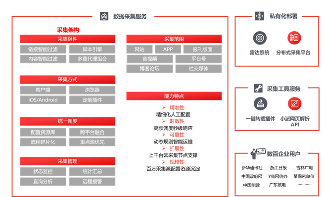 采集目標(biāo)范圍寬廣:包括新聞網(wǎng)頁、APP新聞以及APP推送消息、報刊版面、音視頻、自媒體平臺、博客論壇、國內(nèi)外各主流社交媒體等??刹杉喾N類信息:文本數(shù)據(jù)、互動數(shù)據(jù)、賬戶數(shù)據(jù)、實體數(shù)據(jù)(音視頻、附件和圖片)采集,多種深度數(shù)據(jù)采集。