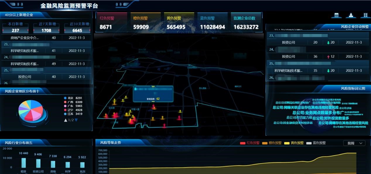 利用冒煙指數(shù)通過大數(shù)據(jù)的采集、融合、標(biāo)注、分析、建模,通過大數(shù)據(jù)監(jiān)測預(yù)警平臺,實現(xiàn)對非法集資、網(wǎng)絡(luò)傳銷、非法放貸等金融風(fēng)險的實時監(jiān)測預(yù)警,監(jiān)測范圍覆蓋財富管理、投資理財、私募、養(yǎng)老、房地產(chǎn)等50余個重點領(lǐng)域,通過平臺可從微觀層面查看企業(yè)全息風(fēng)險畫像及風(fēng)險證據(jù),從宏觀層面可實時監(jiān)控地區(qū)/領(lǐng)域整體風(fēng)險態(tài)勢,實現(xiàn)金融風(fēng)險的早發(fā)現(xiàn)、早預(yù)警、早處置。
