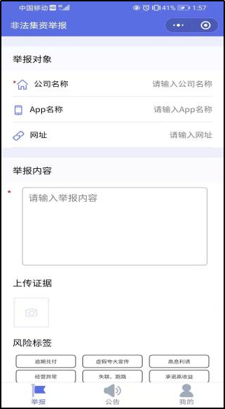 用于金融監(jiān)管部門充分發(fā)動居民群眾對金融風(fēng)險事件進(jìn)行在線投訴舉報,有效拓展線索信息來源,及早發(fā)現(xiàn)金融風(fēng)險線索。