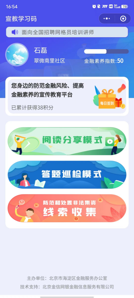 一碼通金融素養(yǎng)宣教服務(wù)平臺,將傳統(tǒng)線下宣教工作轉(zhuǎn)變?yōu)樵诰€化、數(shù)字化、常態(tài)化的工作方式。居民群眾手機掃碼注冊登錄,可隨時在線閱讀學(xué)習(xí)最新法律政策、典型案例剖析、防騙知識等內(nèi)容;社區(qū)、網(wǎng)格員組織開展進(jìn)社區(qū)、進(jìn)農(nóng)村、進(jìn)校園、進(jìn)單位等現(xiàn)場宣教,可登陸一碼通隨手拍攝上傳現(xiàn)場活動照片、視頻等,同時可在線填報活動臺賬進(jìn)行上報;金融監(jiān)管部門通過后臺對轄區(qū)內(nèi)宣教臺賬、在線學(xué)習(xí)閱讀情況、金融素養(yǎng)分?jǐn)?shù)、覆蓋宣教人數(shù)等方面的量化統(tǒng)計分析,實現(xiàn)對整體宣教工作成績、效果的量化評估。
