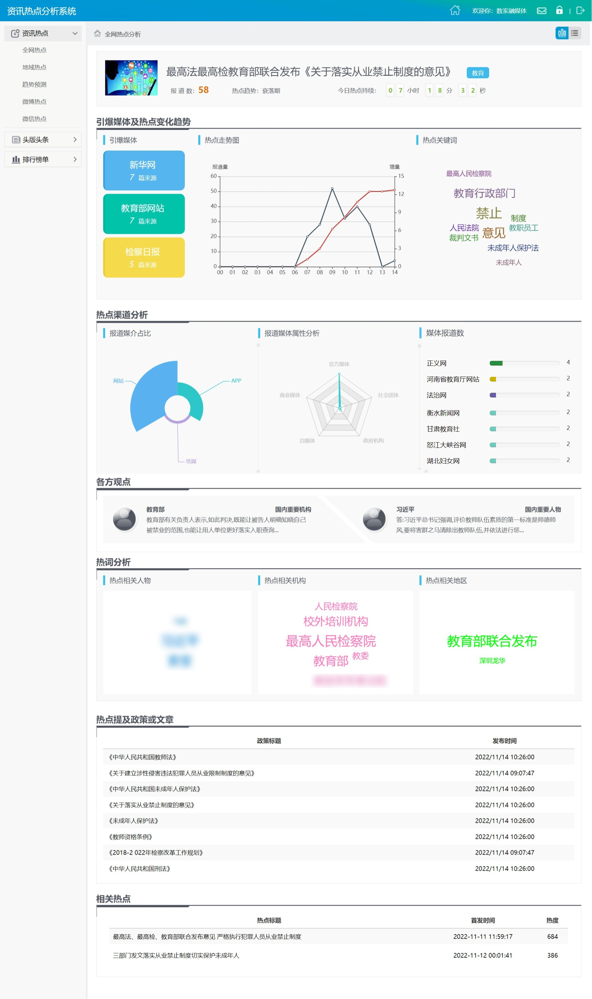 面向全網(wǎng)數(shù)據(jù),通過線索發(fā)現(xiàn)技術(shù)實(shí)時(shí)發(fā)現(xiàn)互聯(lián)網(wǎng)高價(jià)值內(nèi)容,并通過多維知識(shí)庫及智能語義技術(shù)進(jìn)行線索聚合、追蹤分析、發(fā)展趨勢預(yù)測。包含實(shí)時(shí)聚焦、網(wǎng)民關(guān)注、微博爆料、突發(fā)事件、自然災(zāi)害、近期政策、近期會(huì)議、歷史今天等功能模塊。