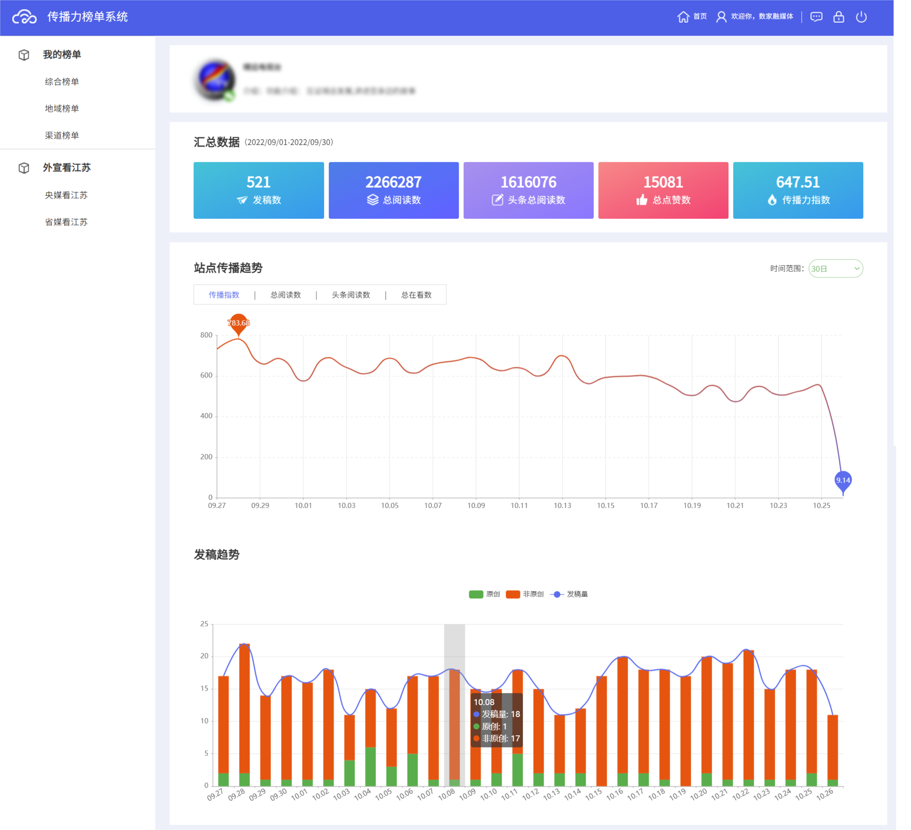 對海量互聯(lián)網(wǎng)傳播數(shù)據(jù)進(jìn)行實(shí)時(shí)監(jiān)測,基于科學(xué)系統(tǒng)的評價(jià)指標(biāo)體系,構(gòu)建權(quán)威榜單,實(shí)現(xiàn)全渠道、多維度、跨周期的站點(diǎn)排行、賬號(hào)排行、內(nèi)容排行、定制化專題排行及跨渠道機(jī)構(gòu)綜合排行。為用戶衡量宣傳主體的傳播力、發(fā)掘優(yōu)質(zhì)內(nèi)容提供依據(jù),有效助力內(nèi)容傳播運(yùn)營。
