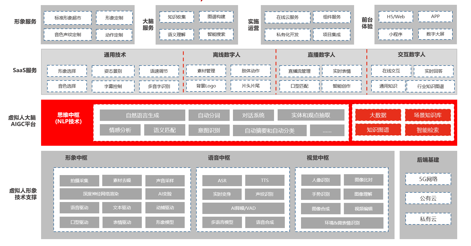 中間層是虛擬人的“大腦”,也是平臺(tái)賦能部分?;谕貭査甲灾骺煽氐腘LP技術(shù)和在眾多領(lǐng)域落地的經(jīng)驗(yàn),虛擬人可以被賦予很多場(chǎng)景應(yīng)用和特定角色,例如,泛行業(yè)垂直領(lǐng)域的智能問答,媒體行業(yè)內(nèi)容自動(dòng)創(chuàng)作及播報(bào)等。