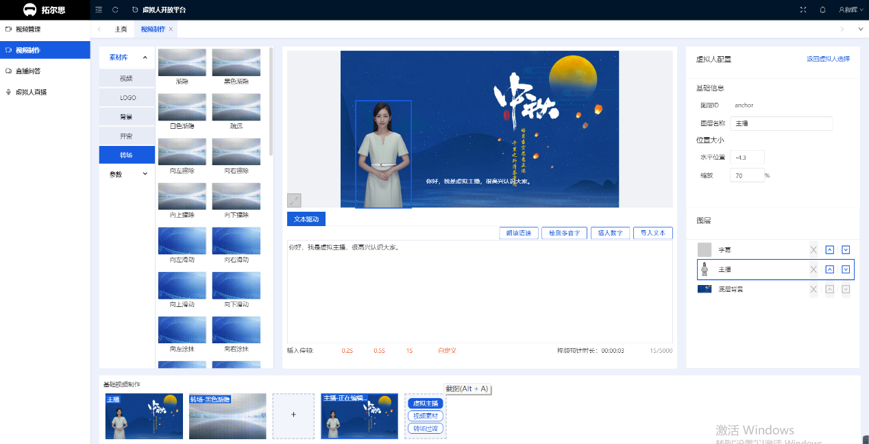 虛擬主播系統(tǒng)是“一站式虛擬主播視頻生產(chǎn)和編輯服務(wù)”的系統(tǒng),用戶可以根據(jù)不同業(yè)務(wù)場(chǎng)景,添加多個(gè)不同鏡頭的虛擬主播視頻段落,每個(gè)視頻段落之間可以添加轉(zhuǎn)場(chǎng)過渡,還可以添加片頭、片尾、以及用戶自己上傳的視頻段落,一鍵快速生成多場(chǎng)景視頻段落,適用于不同平臺(tái)視頻發(fā)布需求,提高播報(bào)類場(chǎng)景的制作效率。