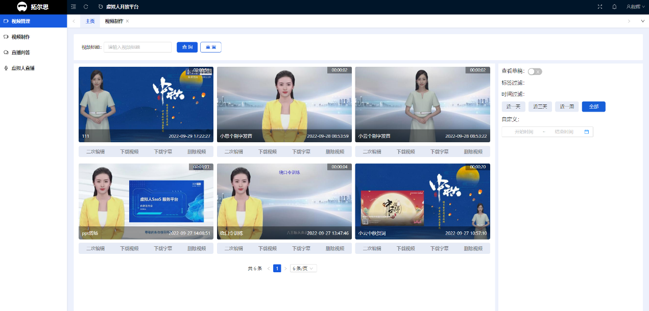 該系統(tǒng)提供視頻管理功能,根據(jù)創(chuàng)建先后順序顯示當(dāng)前用戶已制作視頻,并提供標(biāo)題查詢、標(biāo)簽過濾、時(shí)間過濾等多種篩選方式,方便用戶查找視頻,并對(duì)已有視頻進(jìn)行管理和歸檔,形成自己的數(shù)字資產(chǎn)。
