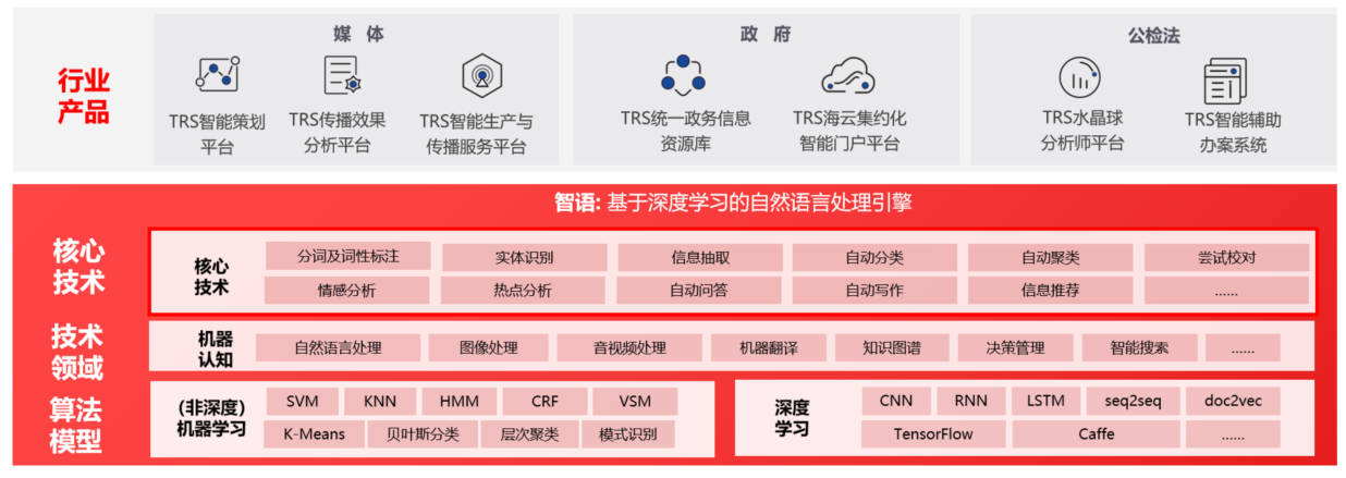 目前,TRS DL- CKM V9已提供數(shù)十個(gè)功能組件、數(shù)百個(gè)調(diào)用接口,具備了較為完整的NLP服務(wù)能力,基于深度學(xué)習(xí)模型的應(yīng)用效果顯著提升。
