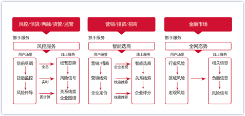 以海量數(shù)據(jù)和完善預警模型為基礎,構(gòu)建風險類型體系,結(jié)合自然語言處理技術,為銀行等金融機構(gòu)評估業(yè)務風險,提供貸前準入、貸中追蹤、貸后監(jiān)控等多場景風控支持。利用大數(shù)據(jù)創(chuàng)新信用風險管理方式,構(gòu)建企業(yè)全輿情信息圖景,助力金融機構(gòu)實現(xiàn)智能風控。