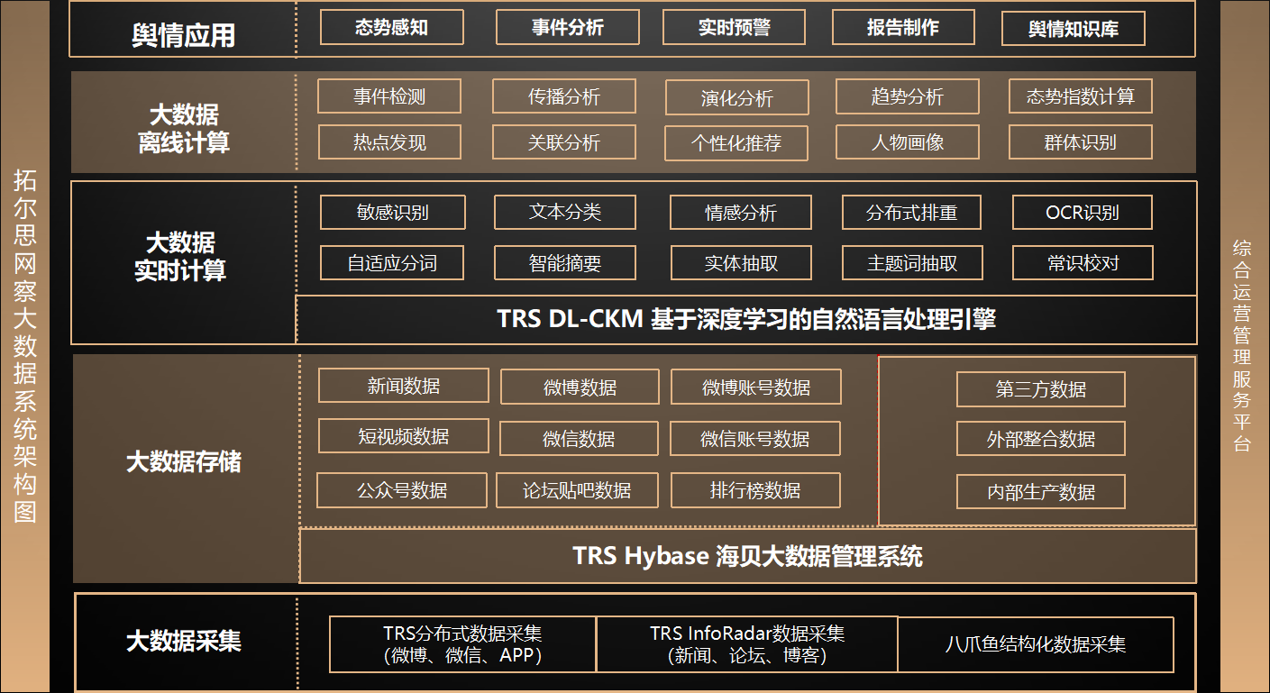 拓爾思網(wǎng)察大數(shù)據(jù)分析平臺(tái)(TRS NetInsight)秉承以用戶需求為中心的設(shè)計(jì)理念,結(jié)合互聯(lián)網(wǎng)輿情監(jiān)測(cè)分析的實(shí)際業(yè)務(wù)流程,在功能設(shè)計(jì)層圍繞“智匯、智庫(kù)、智策”三大理念,依托人工智能、大數(shù)據(jù)、云計(jì)算等技術(shù),實(shí)現(xiàn)了全輿論場(chǎng)的網(wǎng)絡(luò)輿情洞察與研判。同時(shí),順應(yīng)互聯(lián)網(wǎng)視頻內(nèi)容快速發(fā)展等趨勢(shì),拓爾思網(wǎng)察大數(shù)據(jù)分析平臺(tái)融合了視音頻分析等語(yǔ)義智能技術(shù)最新成果,全面提升網(wǎng)絡(luò)輿情分析的智能化、自動(dòng)化水平,解決了網(wǎng)絡(luò)輿情監(jiān)測(cè)中短視頻內(nèi)容分析等新的痛點(diǎn)難點(diǎn)問題,實(shí)現(xiàn)了全輿論場(chǎng)、全媒體形式的網(wǎng)絡(luò)輿情監(jiān)測(cè)、分析、決策一站式服務(wù)。